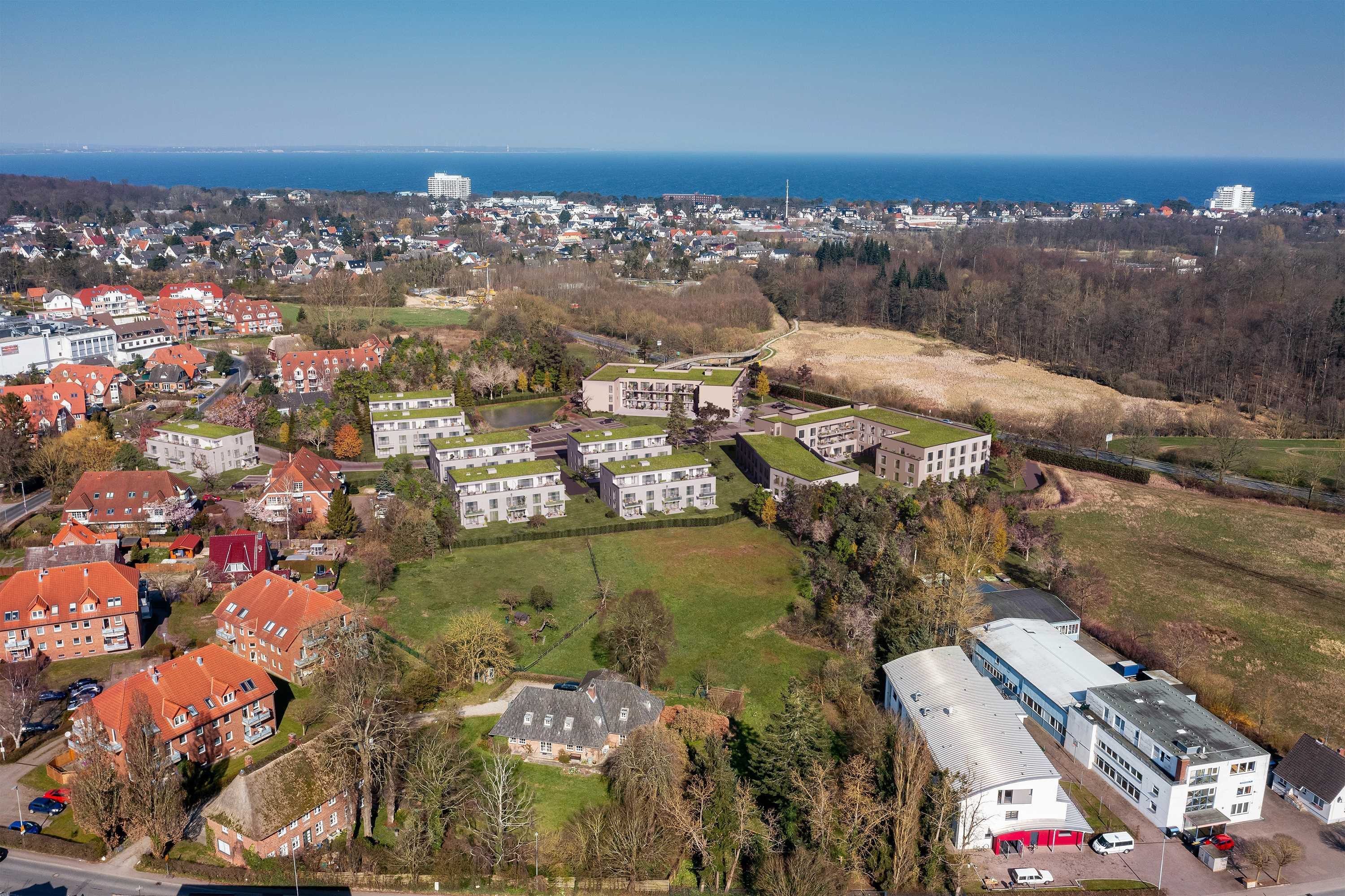 Wir entwickeln in Timmendorfer Strand ein Wohnquartier auf einem 4,5 Hektar großen Grundstück. Derzeit befindet sich das Projekt im Bebauungsplanverfahren. Vorgesehen ist eine Mischung aus Wohnen, Arbeiten und Leben. Geplant sind sieben Mehrfamilienhäuser mit je 13 Wohnungen zur Miete und als Eigentum. Außerdem wird ein Pflegeheim mit 100 Plätzen sowie betreutes Wohnen mit 43 Apartments entstehen. Eine Kita, ein Supermarkt und eine Tankstelle runden das große Projekt für rund 70 Millionen Euro ab.